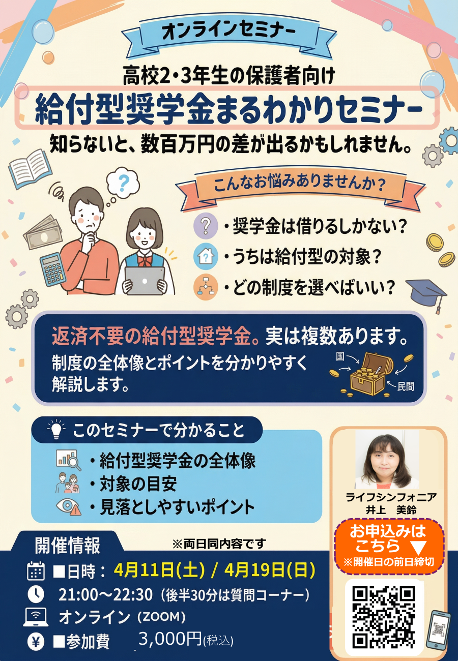 2026年4月20日(月)締切 公益財団法人似鳥国際奨学財団 中学生・高校生・大学生・大学院生・来日留学生が対象の返済不要の奨学金です。 今年度は、1回の募集になります。 中学生でも申し込める奨学金は数が少 …
